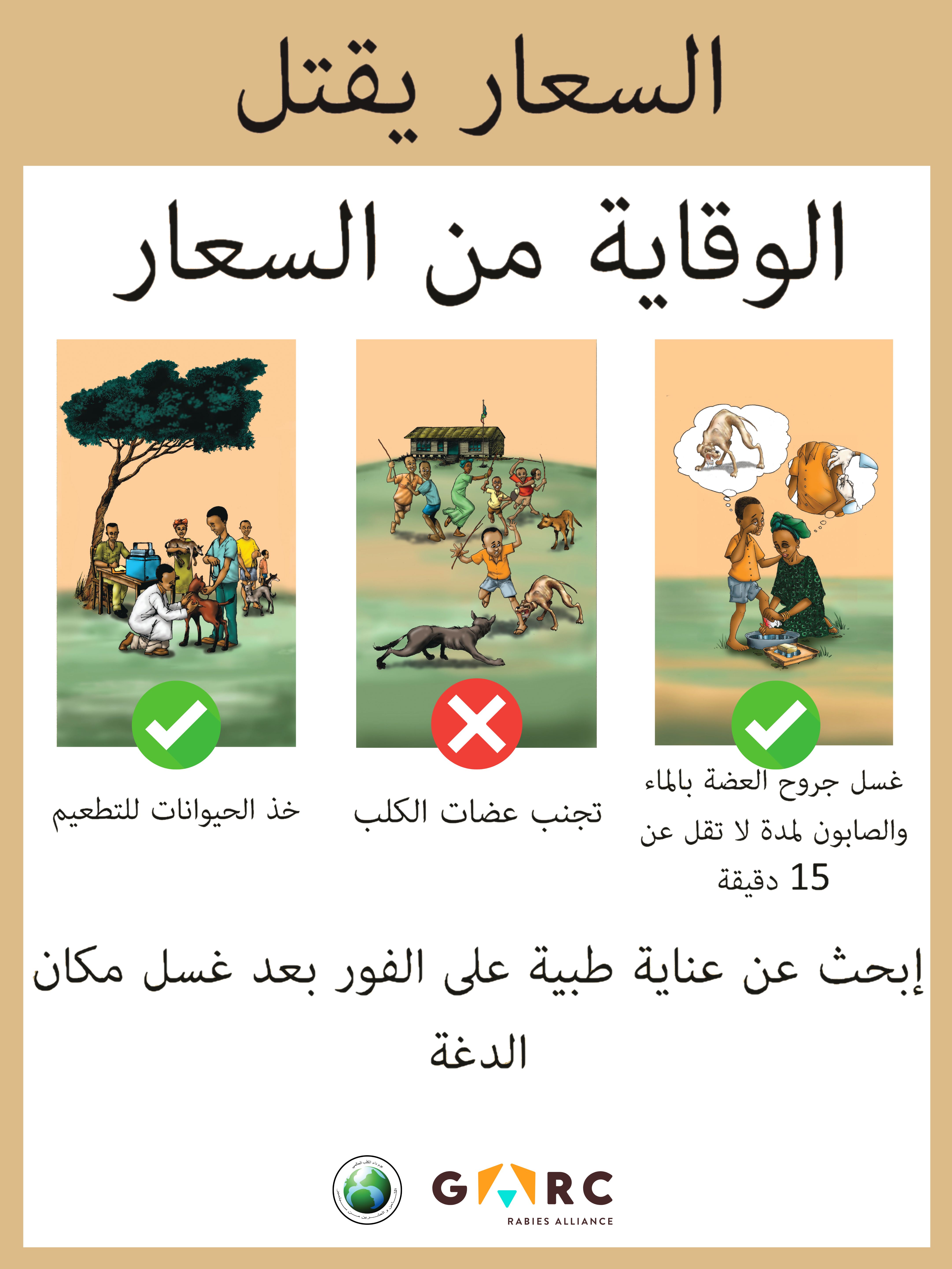 Rabies outreach poster (Arabic) Downloadable resources Bite Management Bite prevention Posters and Factsheets Rabies Prevention Download zip archive of files US CDC GARC CDC/GARC PreviewRabies outreach poster Arabic_compressed.pdf PreviewRabies outreach poster Arabic.jpg