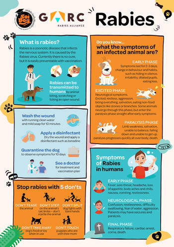 Informative poster on rabies, rabies prevention, bite management, and rabies signs and symptoms.