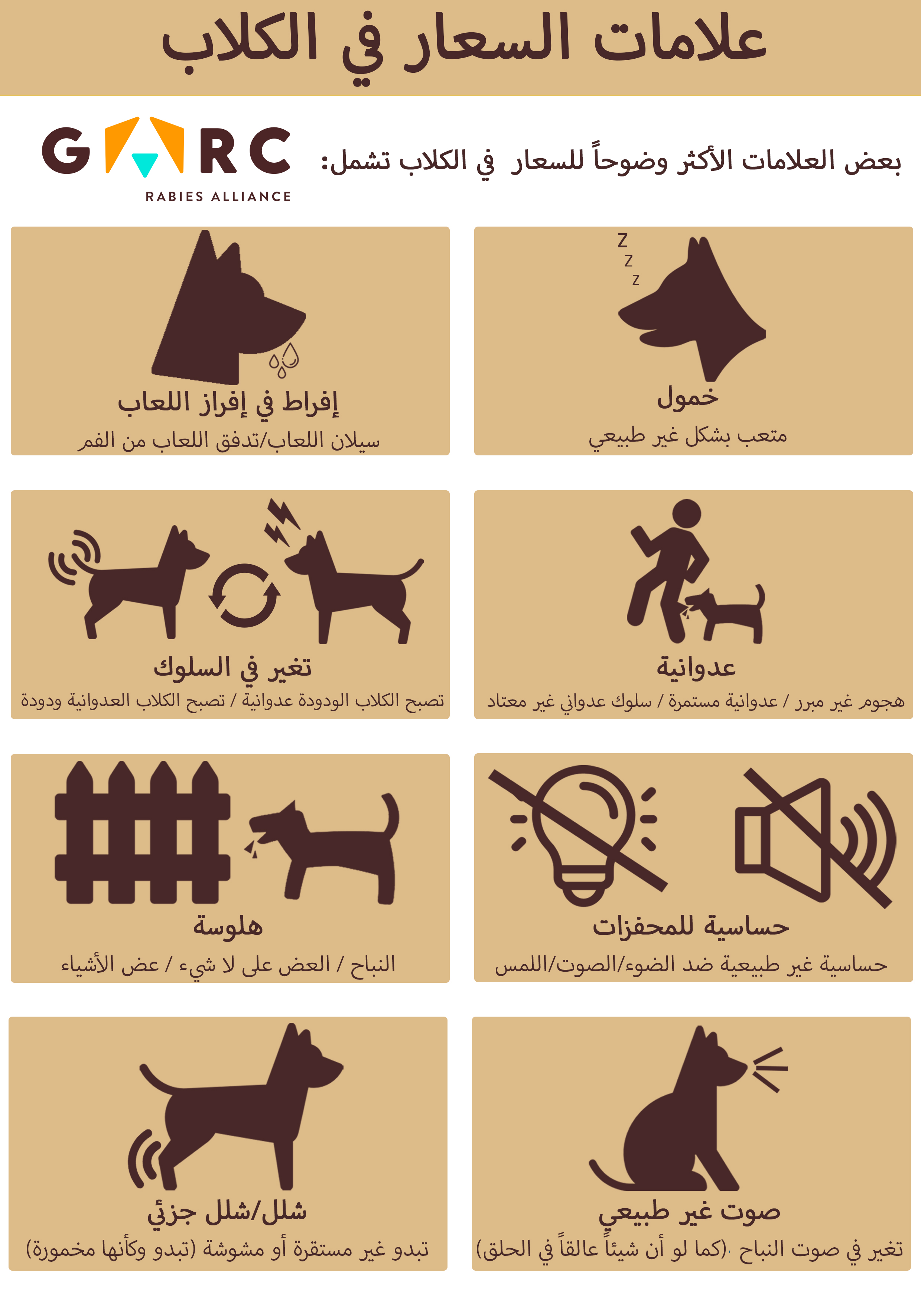 Rabies signs in animals (Arabic) Downloadable resources Signs and symptoms Download zip archive of files GARC An infographic showing the signs of rabies in animals. PreviewArabic_Rabies Signs in Animals infograph_2025.jpg PreviewArabic_Rabies Signs in Animals infograph_2025.pdf
