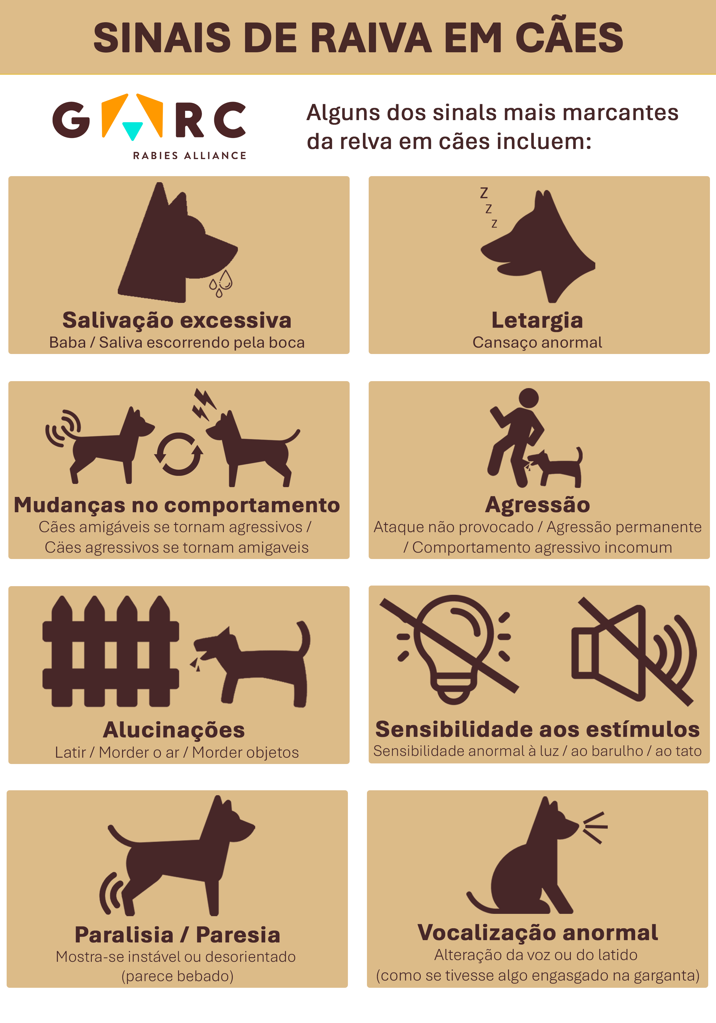 Rabies signs in animals (Portuguese) Downloadable resources Signs and symptoms Download zip archive of files GARC An infographic showing the signs of rabies in animals. PreviewPR_Rabies Signs in dogs infograph_2025.jpg PreviewPR_Rabies Signs in dogs infograph_2025.pdf