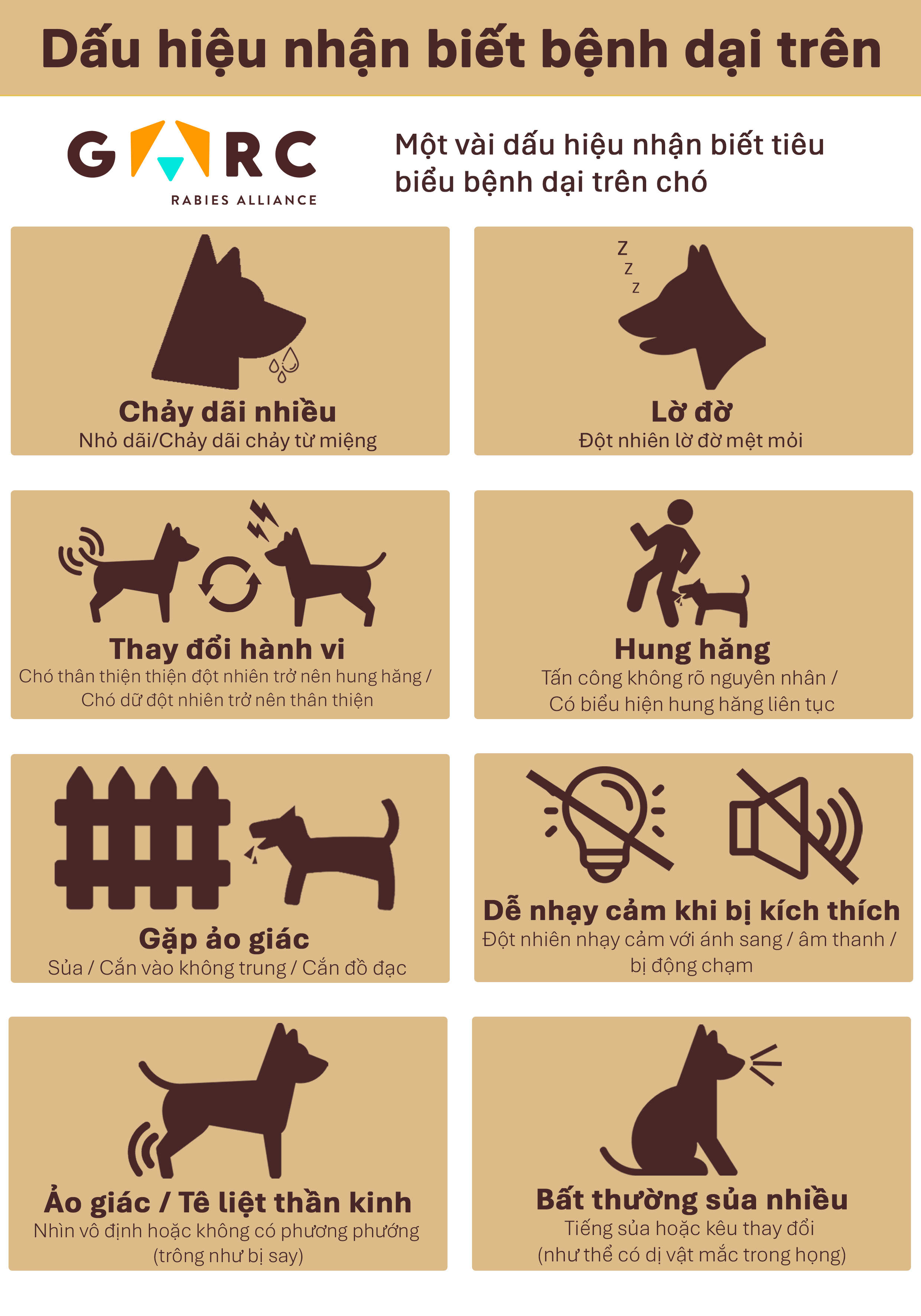 Rabies signs in animals (Vietnamese) Downloadable resources Signs and symptoms Download zip archive of files GARC An infographic showing the signs of rabies in animals. PreviewVI_Rabies Signs in dogs infograph_2025.jpg PreviewVI_Rabies Signs in dogs infograph_2025.pdf