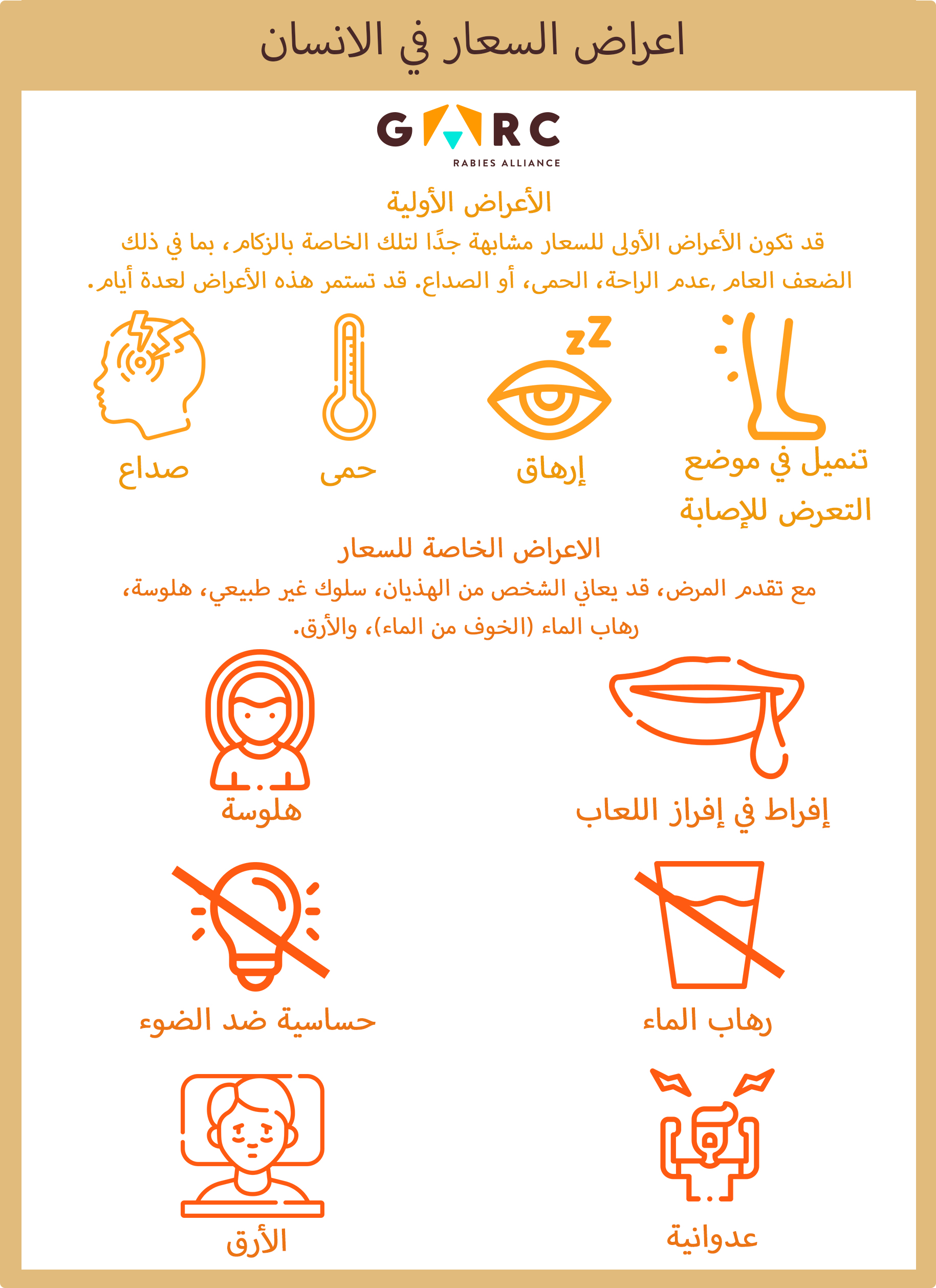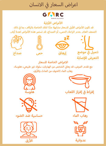 Rabies symptoms in humans (Arabic) Downloadable resources Signs and symptoms Download zip archive of files GARC An infographic showing the symptoms of rabies in humans. PreviewArabic_Rabies symptoms in humans_2025.jpg PreviewArabic_Rabies symptoms in humans_2025.pdf