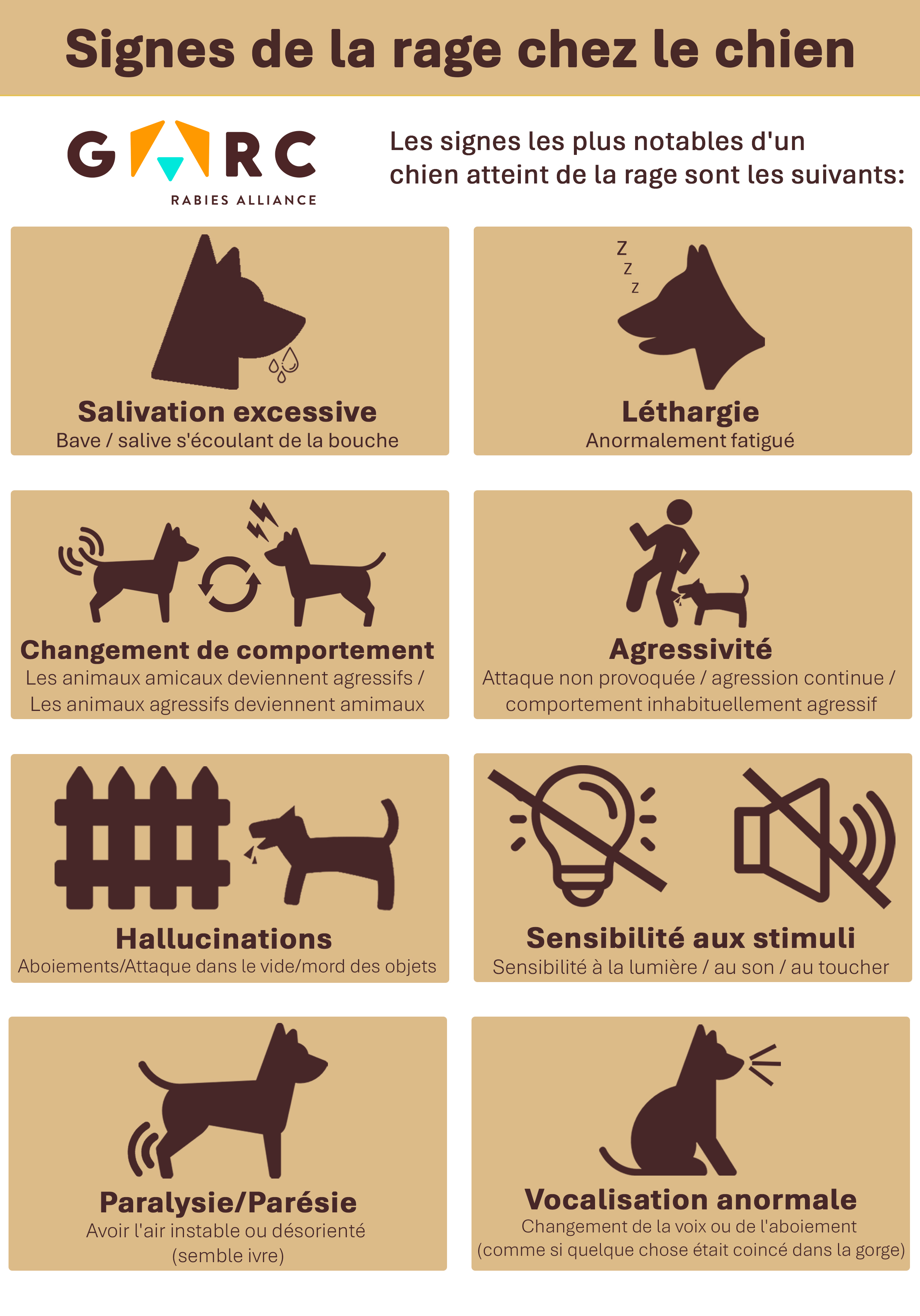 Signes de la rage chez les chiens Infographie Downloadable resources Signs and symptoms Download zip archive of files GARC PreviewFR_Rabies Signs in dogs infograph_2025.jpg PreviewFR_Rabies Signs in dogs infograph_2025.pdf