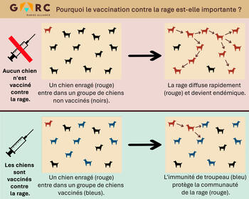 Why rabies vaccination is important (French) Downloadable resources Rabies Prevention Download zip archive of files GARC An infographic explaining the importance of vaccinating dogs against rabies. PreviewFR_Dog vaccination explained_2025.jpg PreviewFR_Dog vaccination explained_2025.pdf